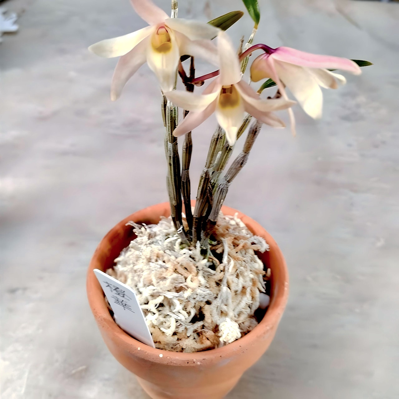 橙華は、淡いオレンジの花弁にピンクが散って、花色のグラデーションが美しいセッコクです。