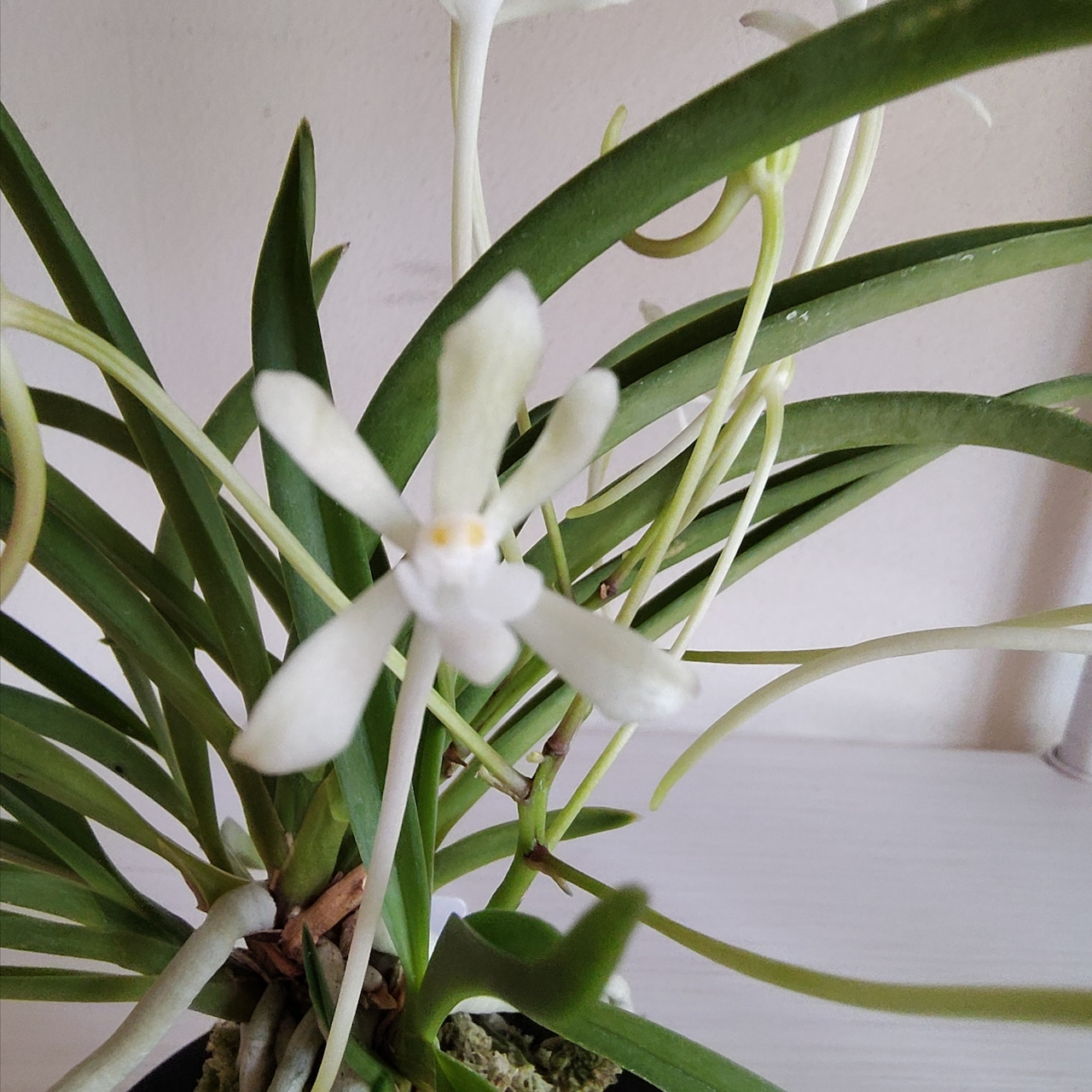 風蘭全般に言えることですが、葉と花とのコントラストも美しいです。